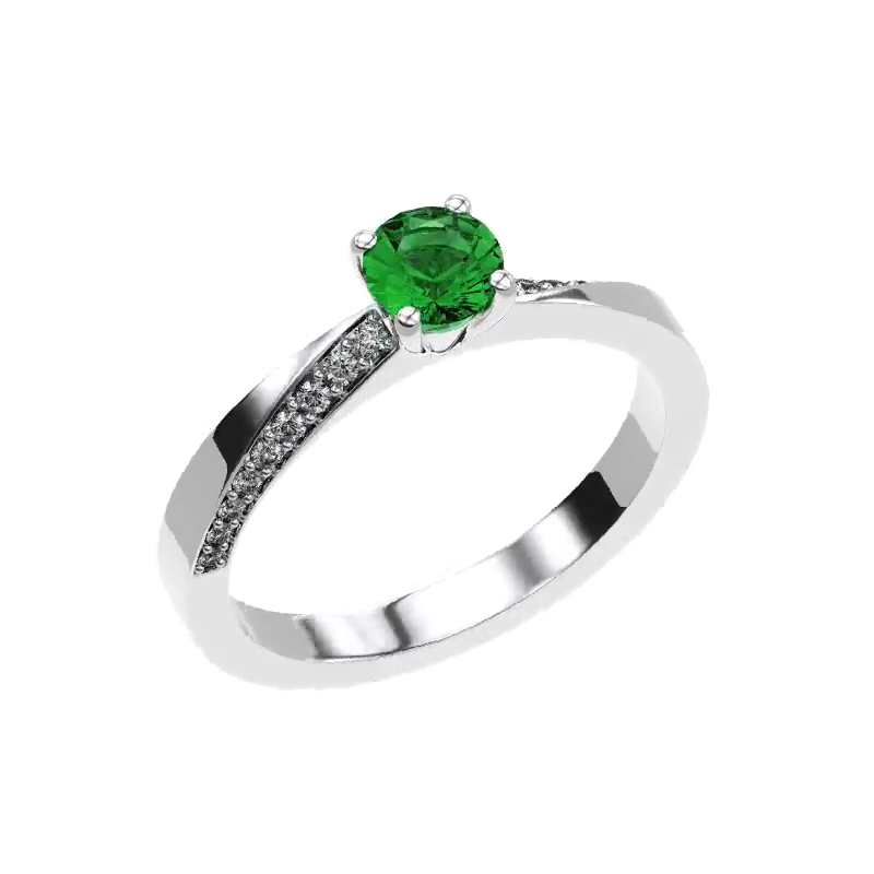 18 K (3,2 g) emerald engagement ring, diamonds paving (0,1 carat), ruby paving (0,11 carat), emerald paving (0,07 carat), black diamond paving (0,11 carat), blue sapphire paving (0,11 carat), pink sapphire paving (0,11 carat)